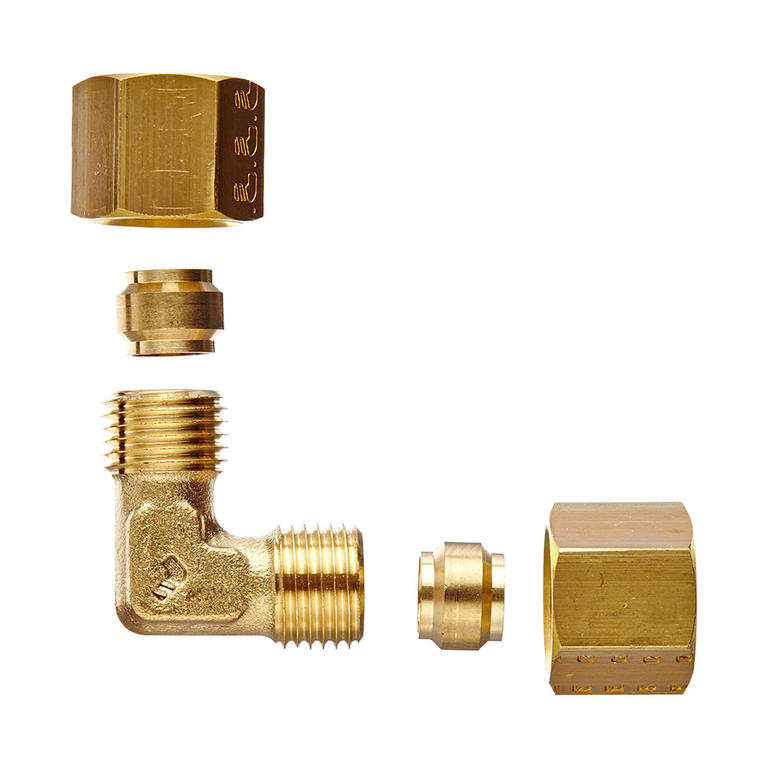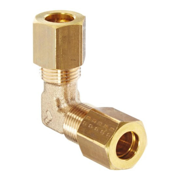 Raccord à compression Legris série 0102, équerre égale en laiton à bague permettant le raccordement de deux tubes de diamètres identiques selon un angle de 90°.