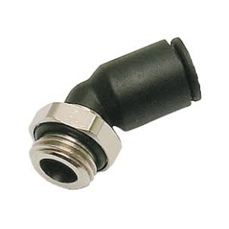 Raccord instantané Legris en polymère-HR série LF3000, équerre à 45° à piquage mâle permettant le raccordement d'un d'un tube à 45° d'une implantation taraudée :