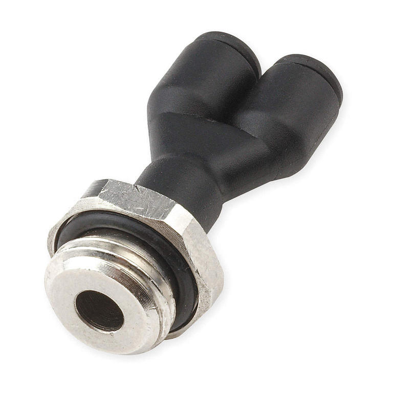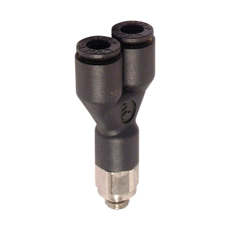 Raccord instantané Legris en polymère-HR série LF3000, raccord en y simple à piquage mâle permettant la distribution de pression ou de débit sur 2 tubes dans l'axe d'une implantation taraudée :