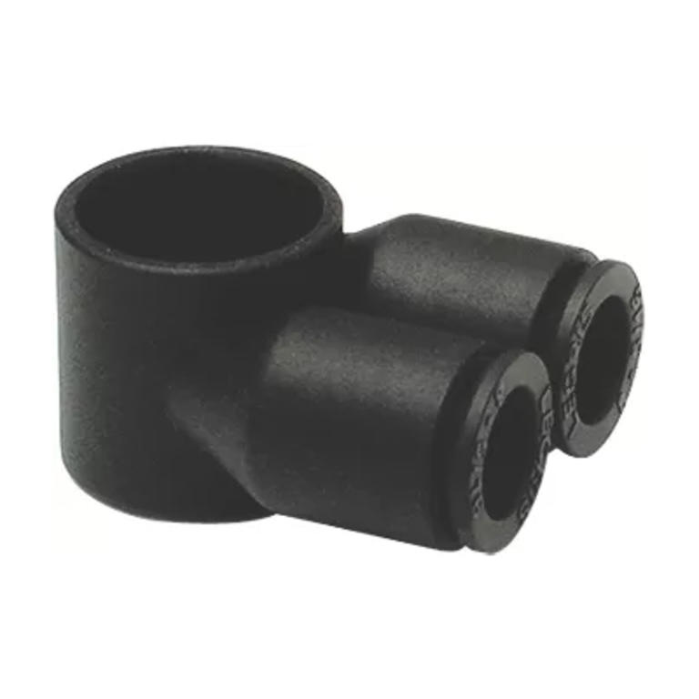 Raccord instantané Legris en polymère-HR série LF3000, corps de banjo en Y permettant le raccordement de 2 tubes à 90° d'une implantation taraudée à l'aide d'une vis série 3527, 3528, 3529 ou 3524 :