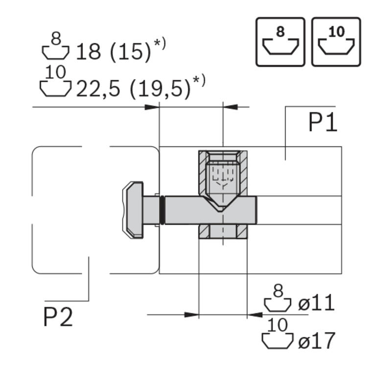 Nécessite un perçage de logement à fond plein DI, DB11 ou trou lisse DI, D11 (pour le profilé avec rainures de 8 mm) et DI, DB17 ou trou lisse DI, D17 (pour le profilé avec rainures de 10 mm)