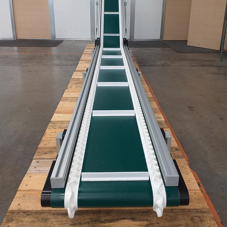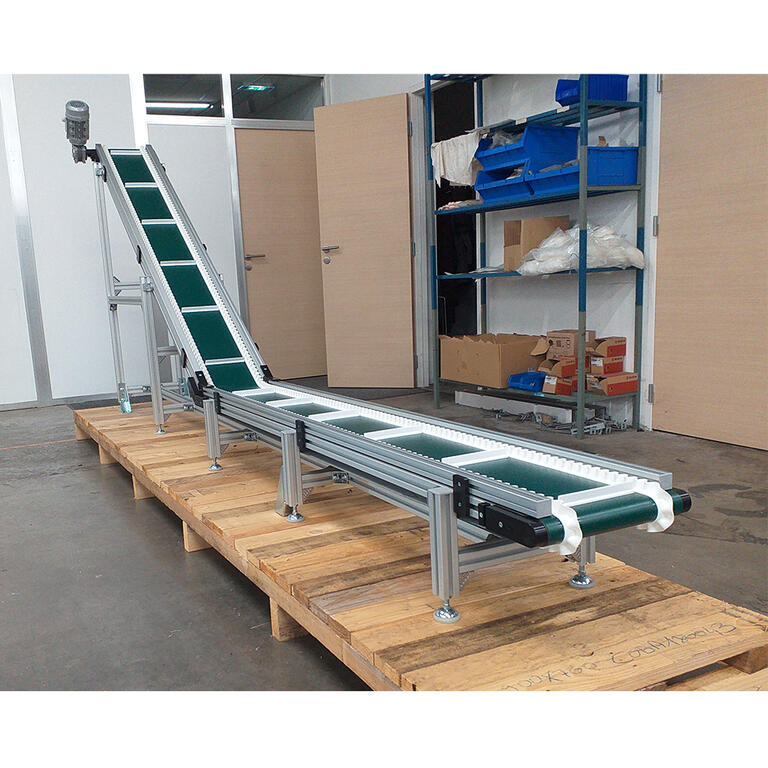 Sa partie horizontale est destinée à la dépose des pièces et sa partie inclinée, sans interruption de la bande, transporte les pièces vers un niveau supérieur.