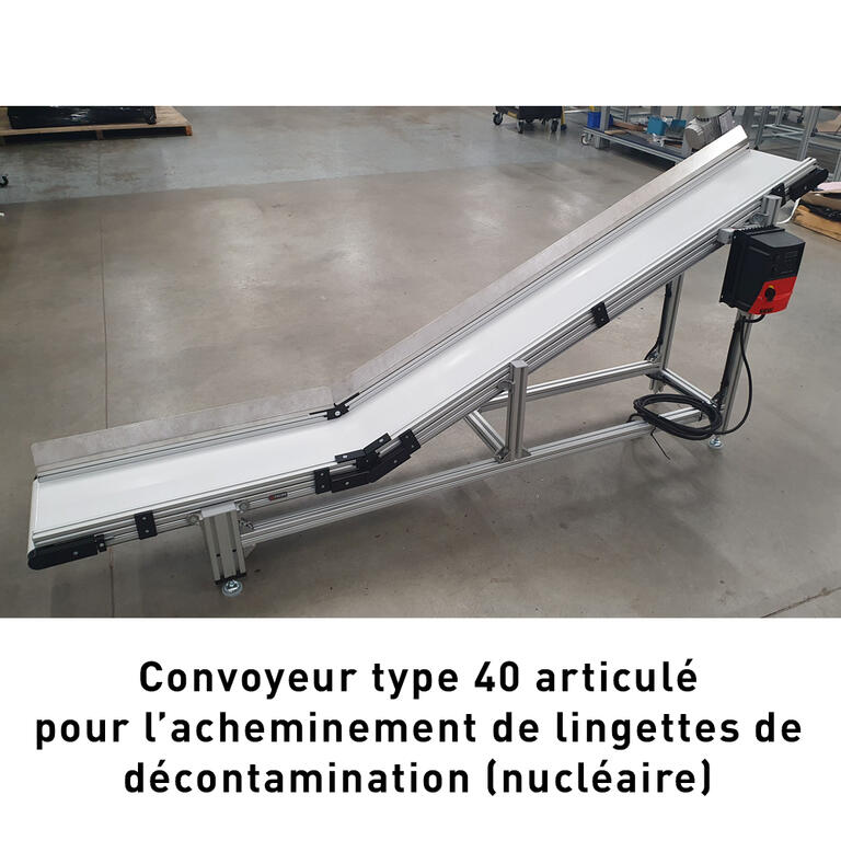 Convoyeur à bande articulé sur châssis en profilés 40, entraînement extrémité