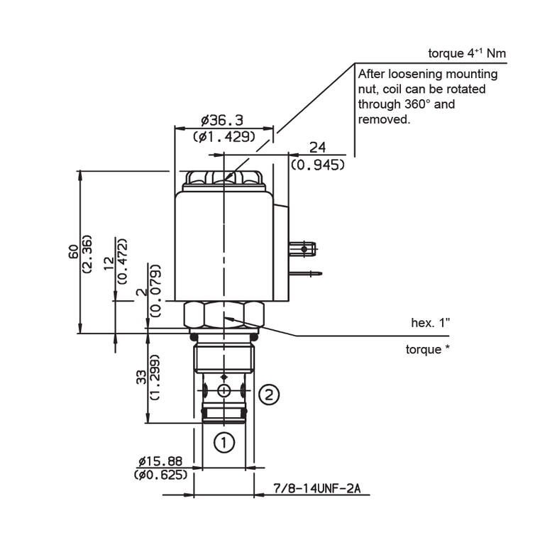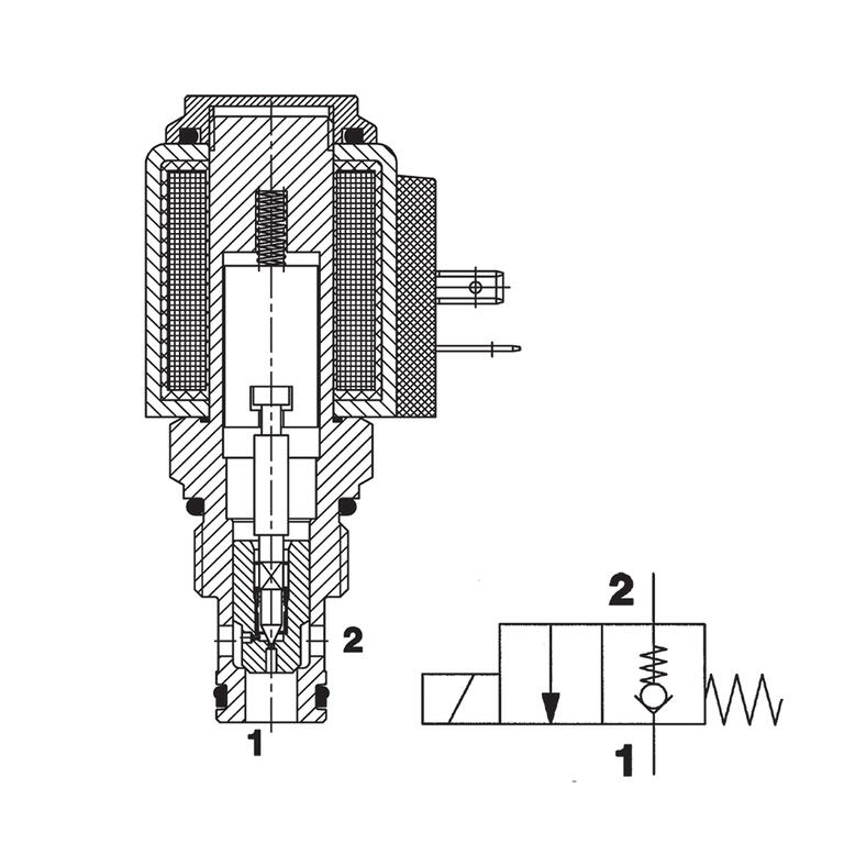 Lorsque le solénoïde n'est pas exité, la valve bloque le passage de 2 vers 1 et agit comme un clapet permettant le passage de 1 vers 2.